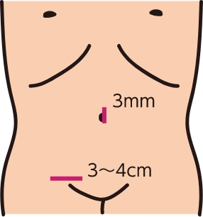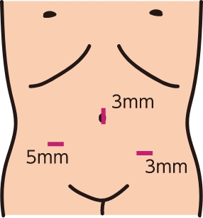 お臍の上を約5mm、左右脇腹を5mmずつ合計3ヶ所切開して行います。