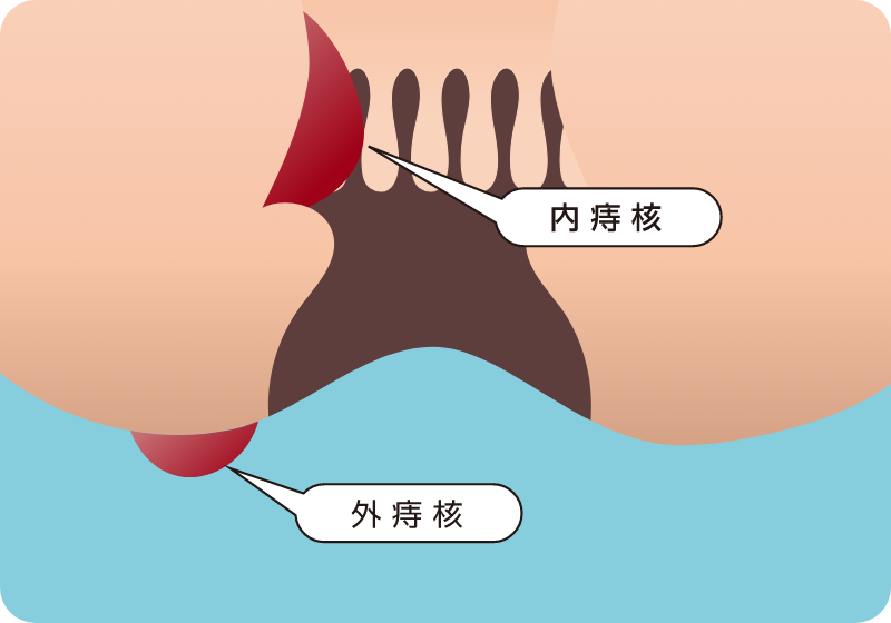 肛門にしこりができる病気です。肛門周辺の血行障害が原因といわれ、立ちっぱなしや座りっぱなしの生活などが原因とされています。肛門の内側にできる内痔核と外側にできる外痔核があります。