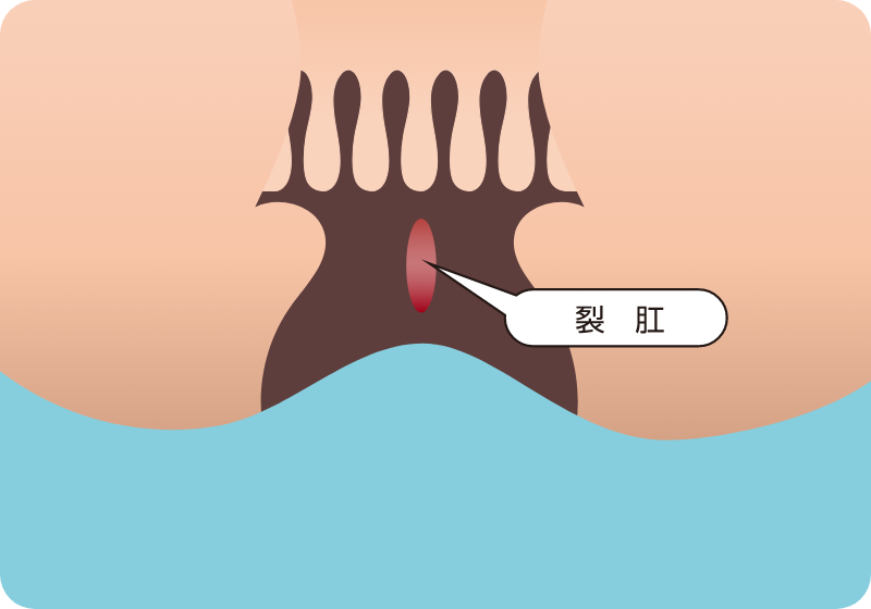 硬い便や頻回の下痢で肛門が裂けてしまう病気です。初期症状は痛みとトイレットペーパーに付着する程度の出血ですが、慢性化すると肛門が狭くなり、排便後の痛みが持続するようになります。