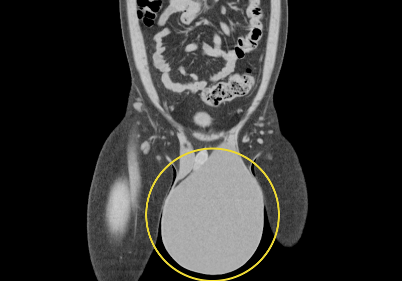 陰嚢水腫は精巣(睾丸)を包む膜(精巣固有鞘膜といいます)の中に水(リンパ液)が溜まり、陰嚢が膨らんだ状態になる病気です。男性であれば子供から大人まで全ての年齢層で起こる良性の病気で、「鼠径部から陰嚢が膨らむ」という症状が鼠径ヘルニアに類似しているのが特徴です。成人の陰嚢水腫については、原因がはっきり分かっていません。外傷や感染などにより生じた精巣固有膜の病的状態(液体の分泌と吸収のバランスが崩れている状態)等が、要因と考えられています。根治するためには手術が必要となります。