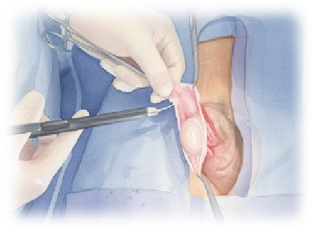 2) 陰嚢の皮膚を3~4cm切開する。